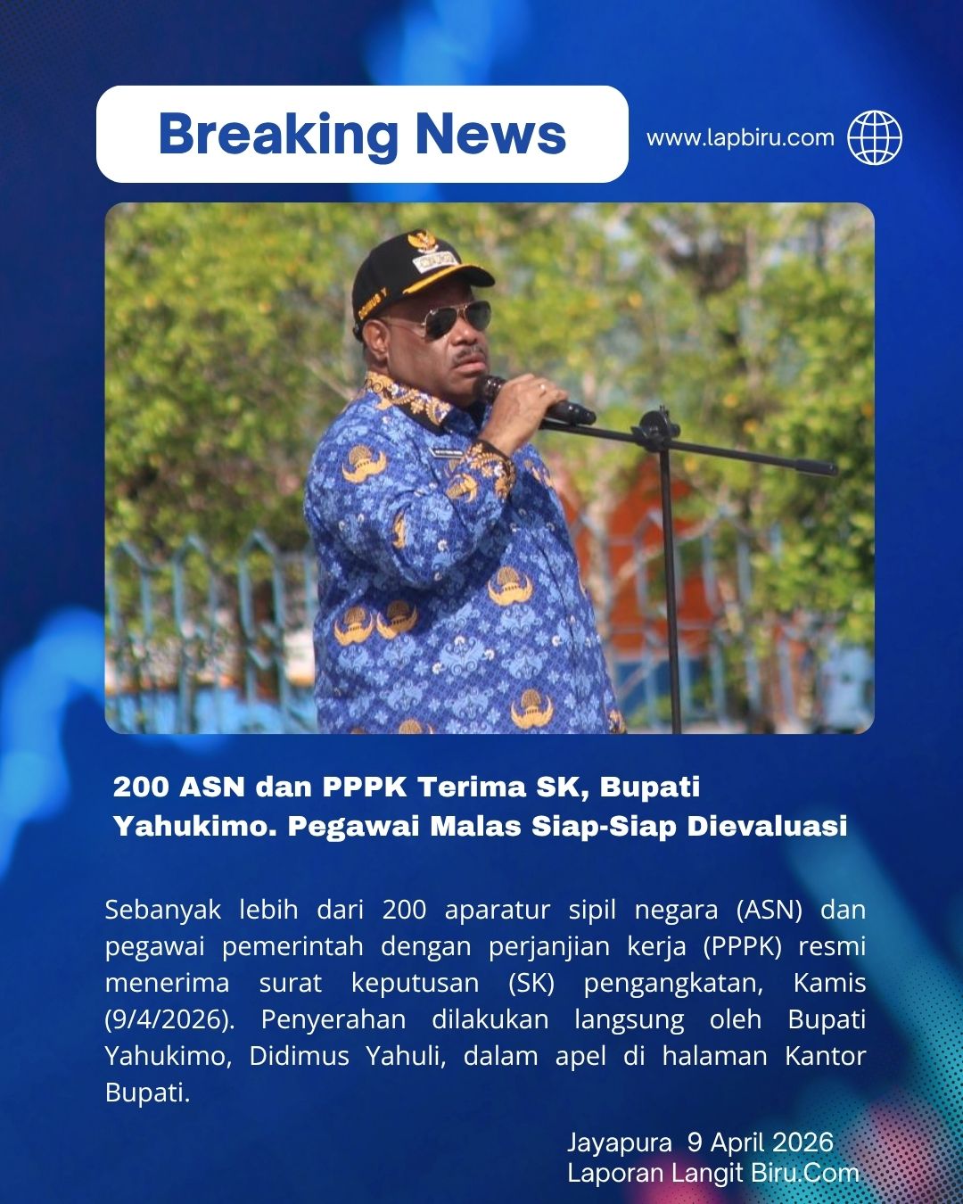 Sebanyak lebih dari 200 aparatur sipil negara (ASN) dan pegawai pemerintah dengan perjanjian kerja (PPPK) resmi menerima surat keputusan (SK) pengangkatan, Kamis (9/4/2026). Penyerahan dilakukan langsung oleh Bupati Yahukimo, Didimus Yahuli, dalam apel di halaman Kantor Bupati.