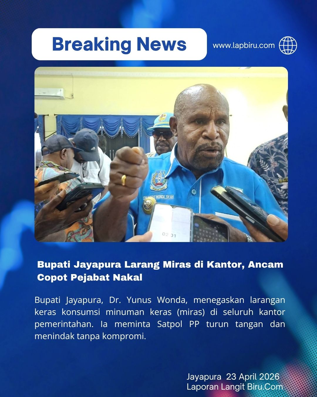 Bupati Jayapura, Dr. Yunus Wonda, menegaskan larangan keras konsumsi minuman keras (miras) di seluruh kantor pemerintahan. Ia meminta Satpol PP turun tangan dan menindak tanpa kompromi.