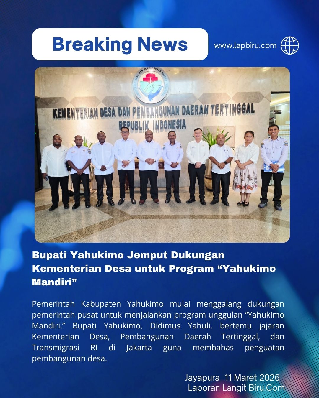 Pemerintah Kabupaten Yahukimo mulai menggalang dukungan pemerintah pusat untuk menjalankan program unggulan “Yahukimo Mandiri.” Bupati Yahukimo, Didimus Yahuli, bertemu jajaran Kementerian Desa, Pembangunan Daerah Tertinggal, dan Transmigrasi RI di Jakarta guna membahas penguatan pembangunan desa.