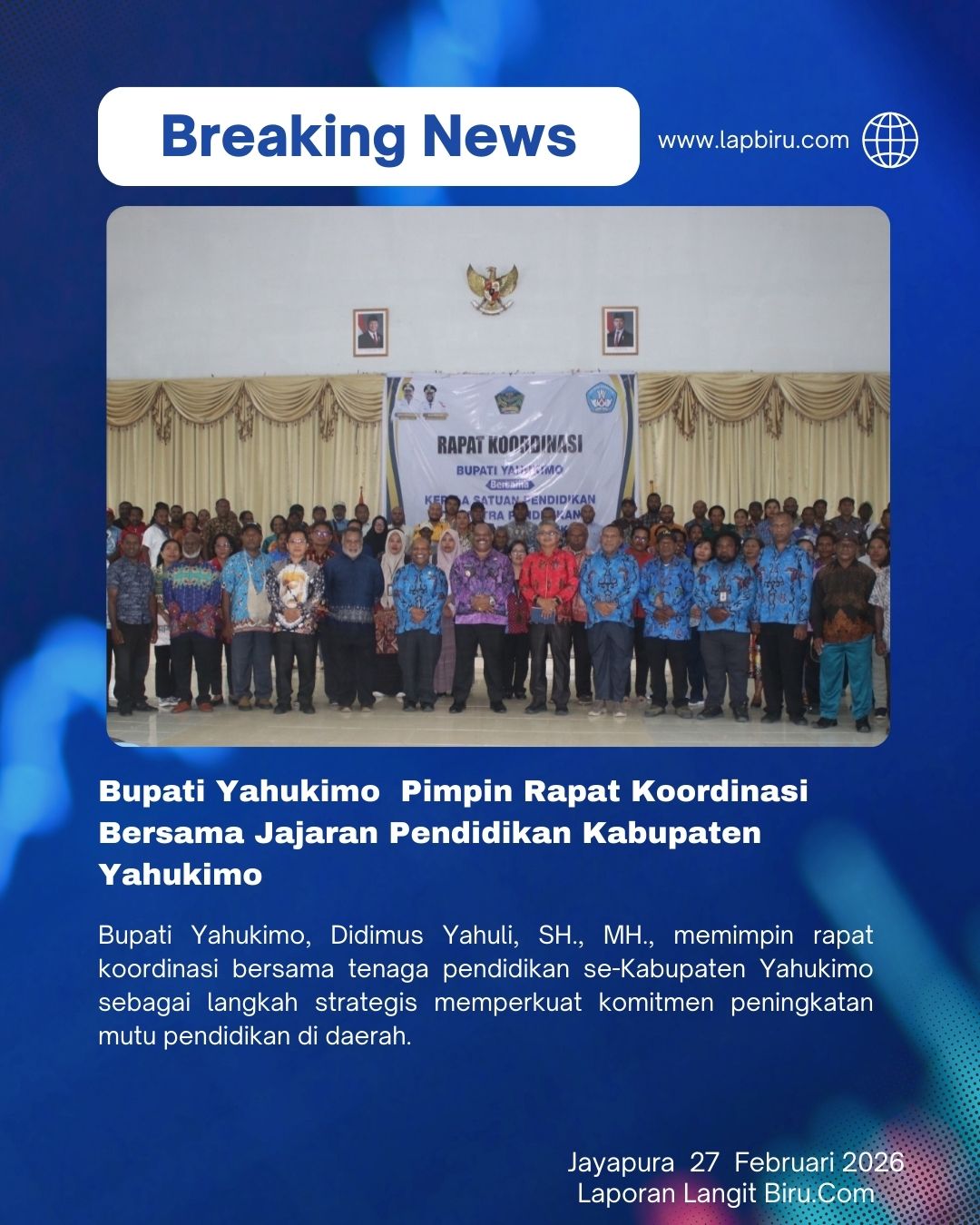 Bupati Yahukimo, Didimus Yahuli, SH., MH., memimpin rapat koordinasi bersama tenaga pendidikan se-Kabupaten Yahukimo sebagai langkah strategis memperkuat komitmen peningkatan mutu pendidikan di daerah.