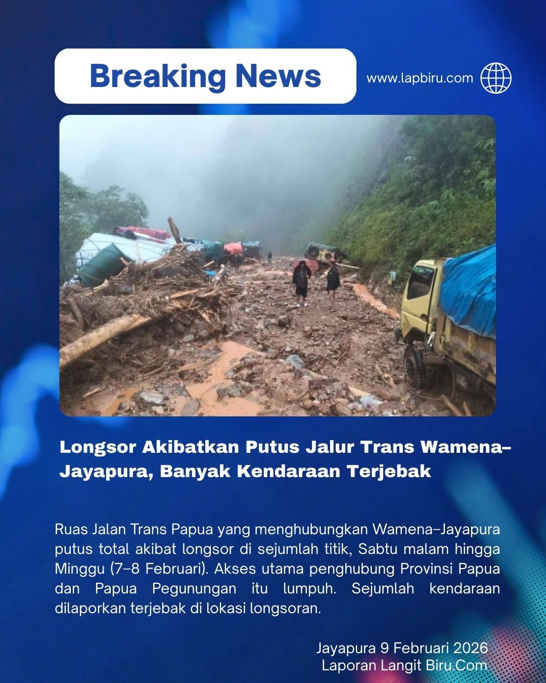 Jayapura — Ruas Jalan Trans Papua yang menghubungkan Wamena–Jayapura putus total akibat longsor di sejumlah titik, Sabtu malam hingga Minggu (7–8 Februari).