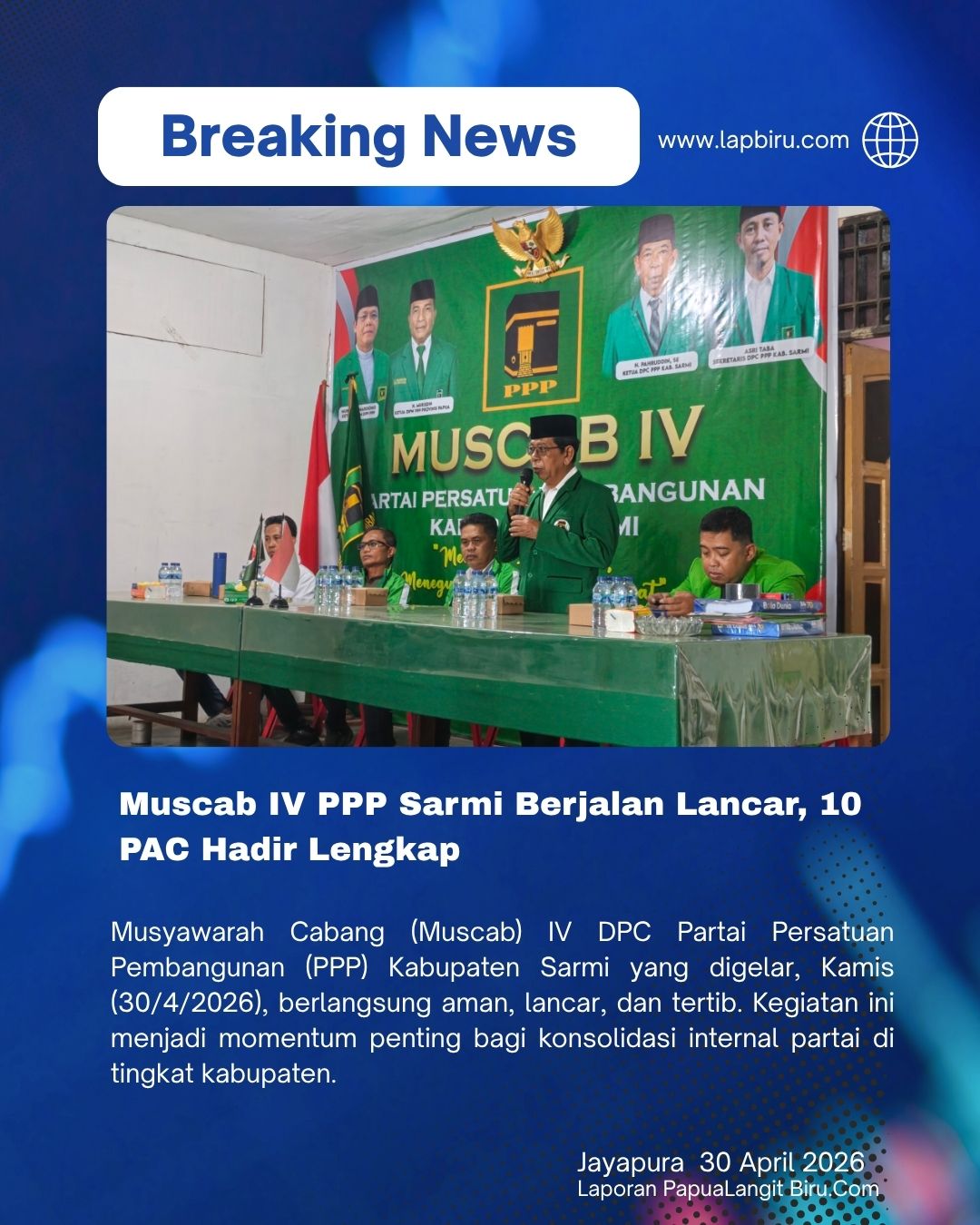 SARMI, Lapbiru.com – Musyawarah Cabang (Muscab) IV DPC Partai Persatuan Pembangunan (PPP) Kabupaten Sarmi yang digelar, Kamis (30/4/2026), berlangsung aman, lancar, dan tertib. Kegiatan ini menjadi momentum penting bagi konsolidasi internal partai di tingkat kabupaten.