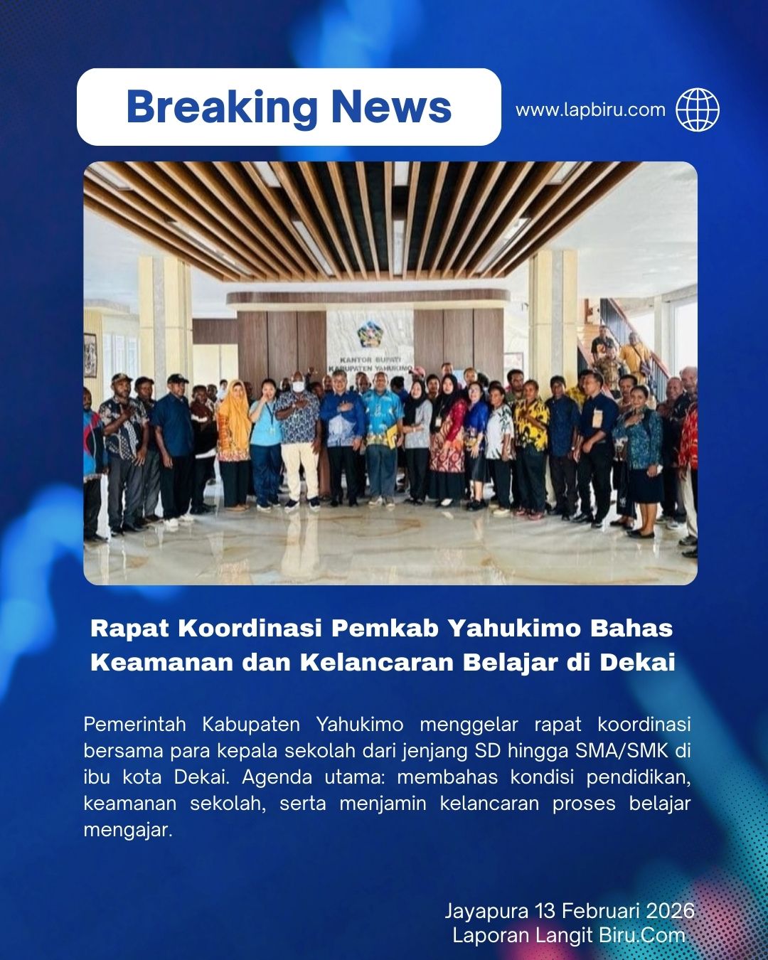 Pemerintah Kabupaten Yahukimo menggelar rapat koordinasi bersama para kepala sekolah dari jenjang SD hingga SMA/SMK di ibu kota Dekai. Agenda utama: membahas kondisi pendidikan, keamanan sekolah, serta menjamin kelancaran proses belajar mengajar.