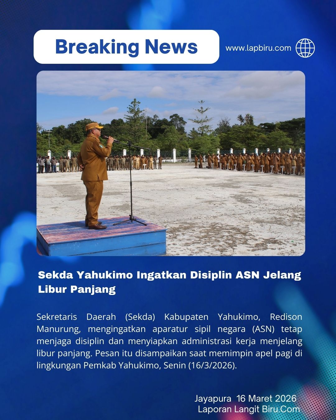 Sekretaris Daerah (Sekda) Kabupaten Yahukimo, Redison Manurung, mengingatkan aparatur sipil negara (ASN) tetap menjaga disiplin dan menyiapkan administrasi kerja menjelang libur panjang. Pesan itu disampaikan saat memimpin apel pagi di lingkungan Pemkab Yahukimo, Senin (16/3/2026).