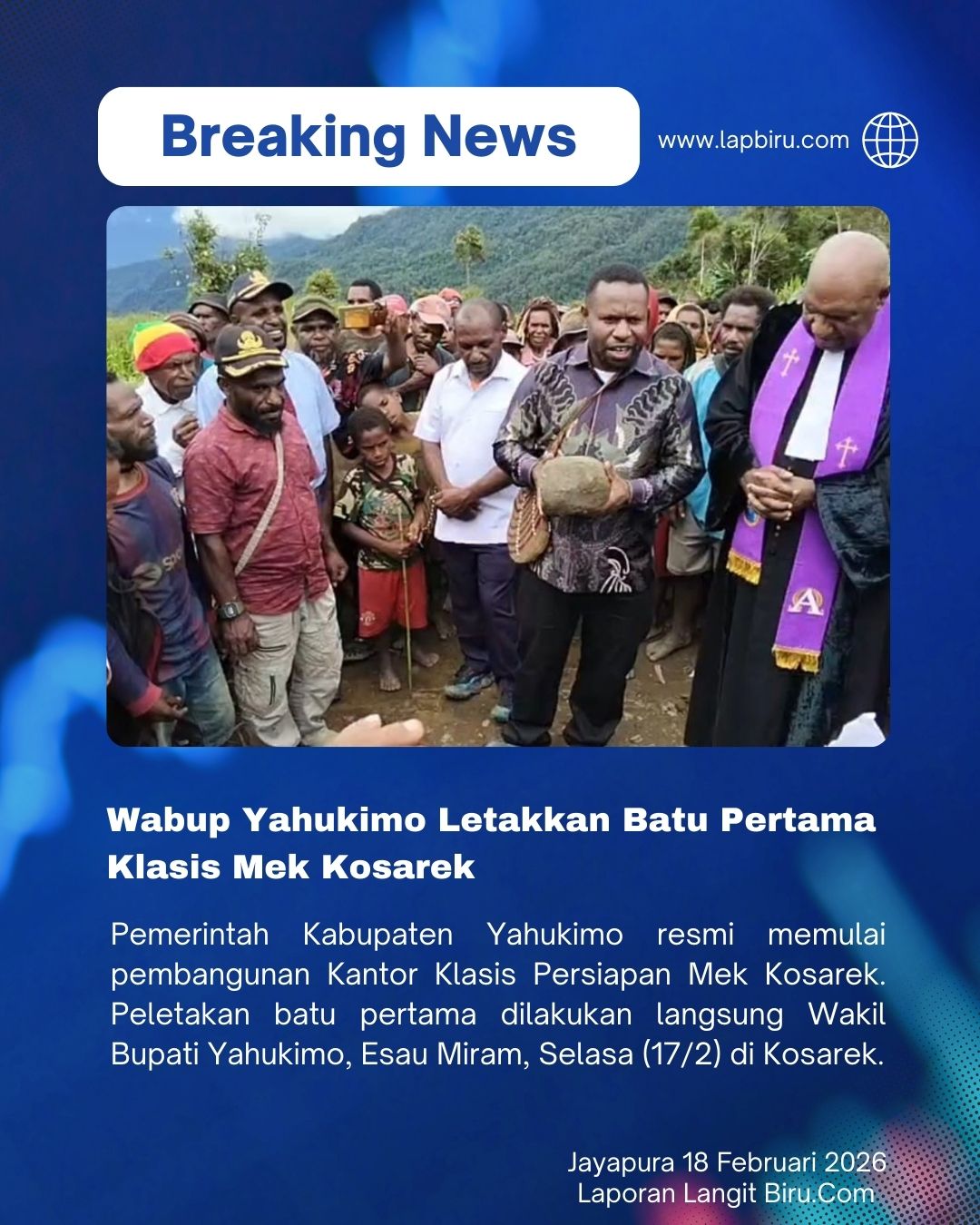 Pemerintah Kabupaten Yahukimo resmi memulai pembangunan Kantor Klasis Persiapan Mek Kosarek. Peletakan batu pertama dilakukan langsung Wakil Bupati Yahukimo, Esau Miram, Selasa (17/2) di Kosarek.